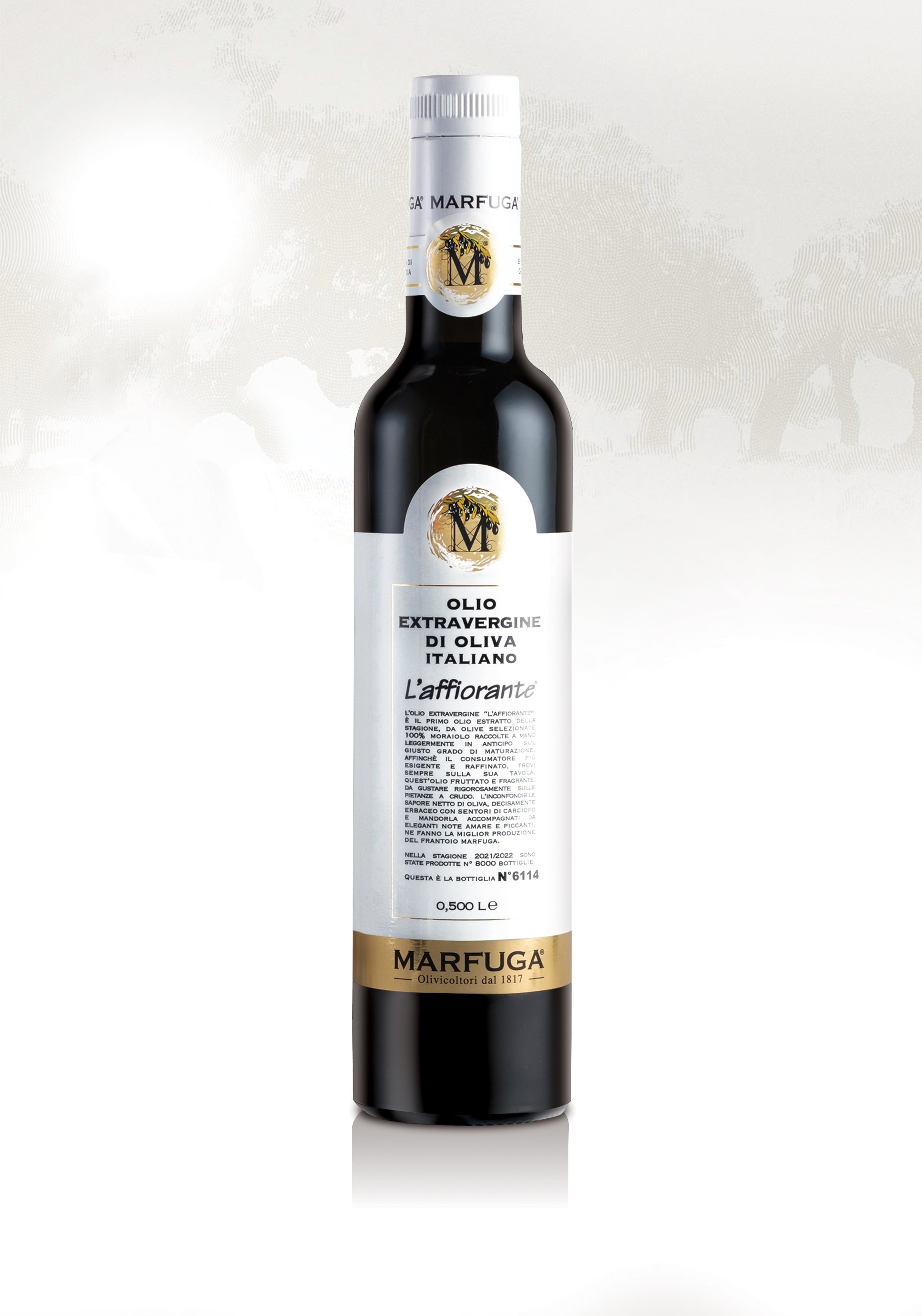 The italian extra virgin olive oil “L’Affiorante®” is the first one to be extracted in the season. It is made from 100% prime quality Moraiolo olives harvested by hand before they are fully ripened, so that the most exigent and refined consumers can enjoy this fragrant fruity oil at their table, strictly RAW. The unmistakable flavour of olives, positively grassy with prominent hints of artichokes and un-ripened almond in addition to a resolute, intense bitterness and peppery punch, makes it the best product of the MARFUGA® mill.